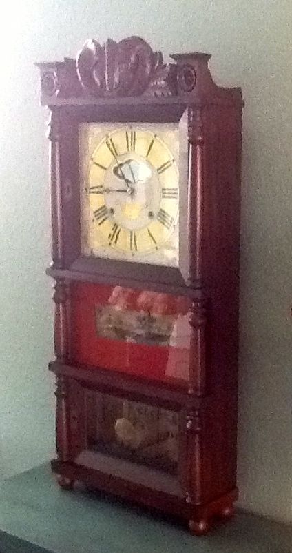 The clock is an antique triple decker clock manufactured by the firm of Chauncey